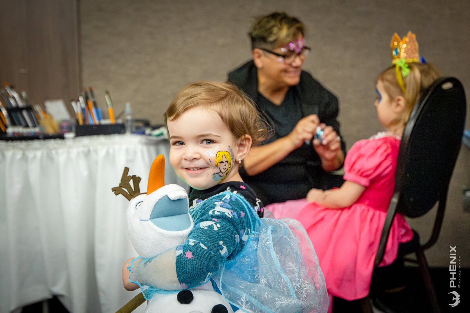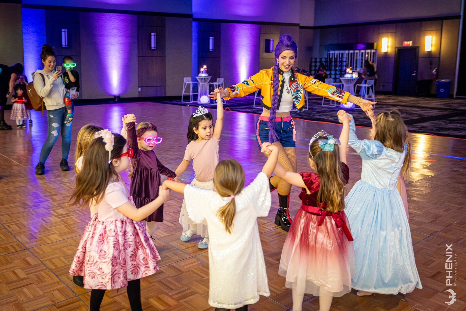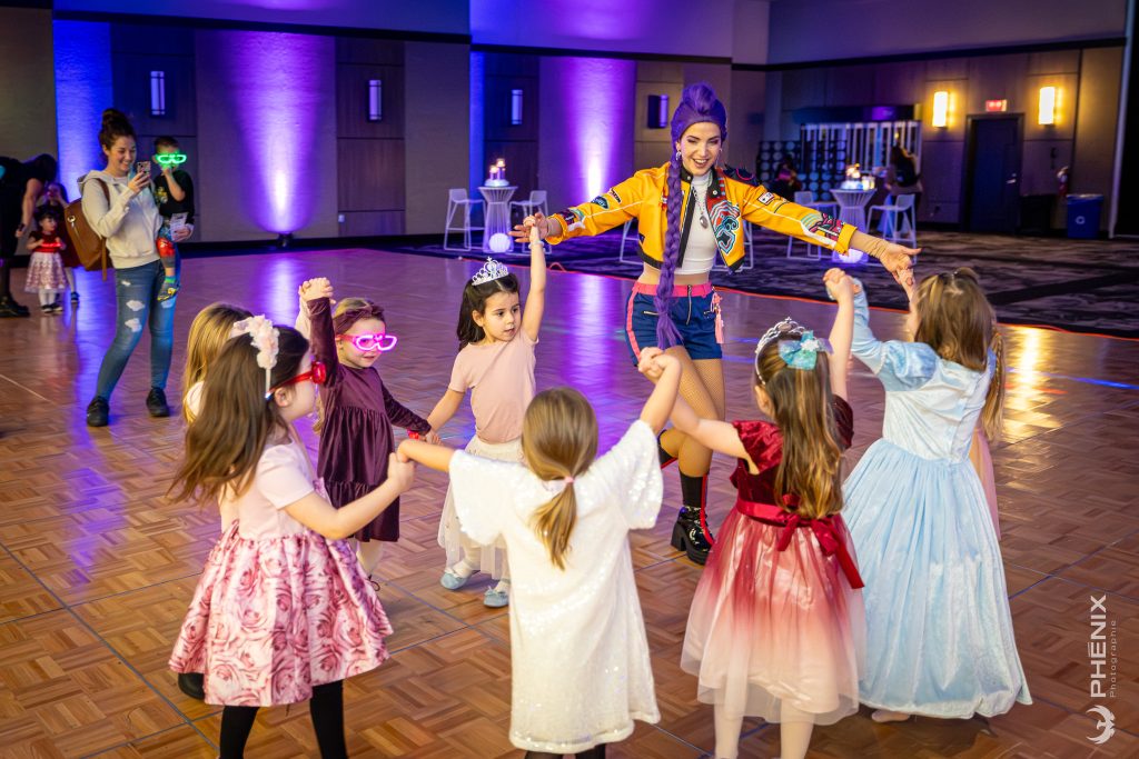 Dès leur arrivée sous les arches de nuages, les tout-petits découvraient l’ampleur de la fête : la piste de danse au loin entourée de stations de jeux vidéos, la possibilité de colorier une gigantesque fresque, de bricoler une lanterne ou une boutonnière ou encore de se faire maquiller pour entrer pleinement dans la magie. Ils pouvaient aussi jouer au rallye-bingo et se faire photographier dans un décor digne d’avoir la tête dans les nuages! La journée a pris une tournure encore plus magique lorsque la célèbre K-Pop Hunter Rumi a fait une apparition surprise et a même offert une performance sur la piste de danse.